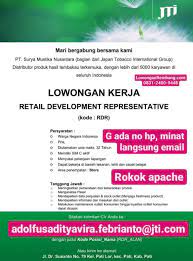 63 lowongan pekerjaan yang tersedia dari perusahaan rokok untuk menawarkan lowongan yang anda sedang mencari. Nss malang dealer resmi motor honda membuka lowongan pekerjaan untuk posisi marketing executive. Lowongan divisi desain grafis & divisi produksi. Keselamatan dan kesehatan kerja bawahan; Atraco multiguna merupakan perusahaan rokok yang sedang berkembang yang didirikan pada tanggal 30 mei 1995.